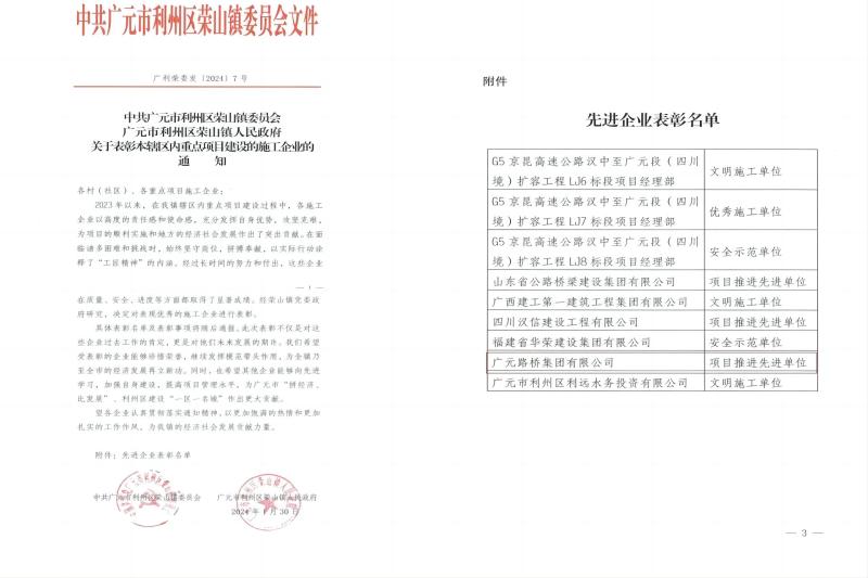 1月30日,公司收到利州區榮山鎮委員會、榮山鎮人民政府發來的關于表彰本轄區內重點項目建設的施工企業的通知{廣利榮委發(2024)7號},路橋集團被點名表彰,路橋集團榮山鎮高坑口至周家壩項目部在面對建設前期諸多困難和挑戰時,迎難而上,發揚拼搏奉獻,以實際精神詮釋了“工匠精神”的內涵。